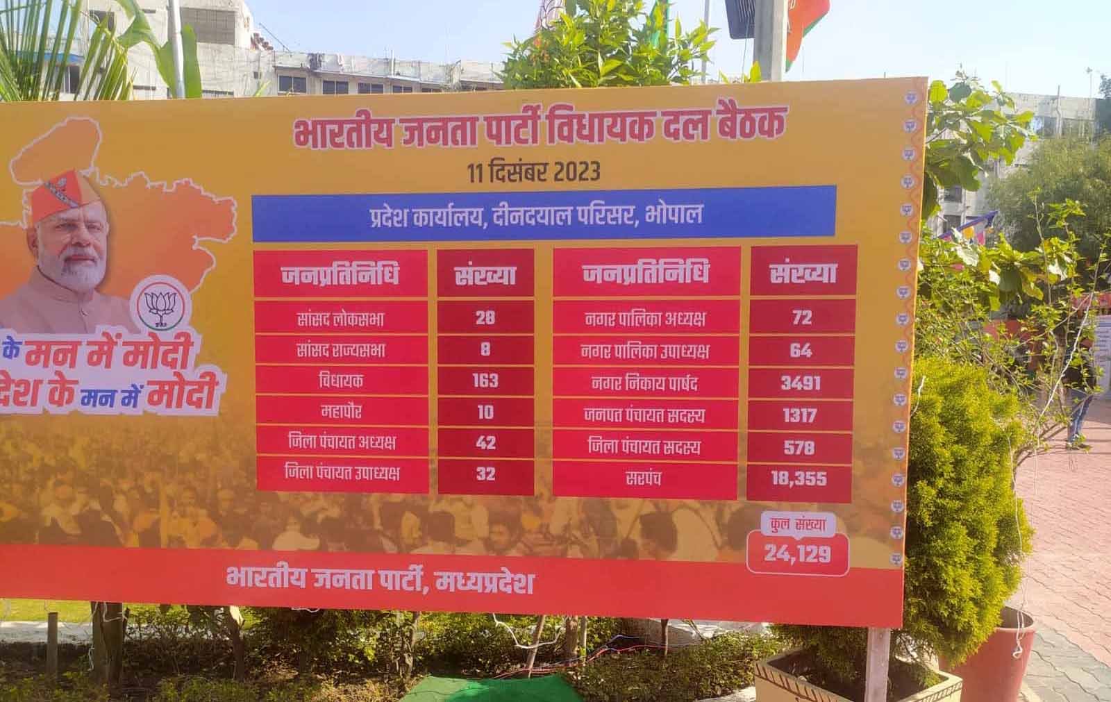 भाजपा ने विधायक दल की बैठक के लिए अपने प्रदेश दफ्तर को जिस अंदाज में सजाया है। वह भी एक-एक विधायक को कई संदेश दे रहा है। भाजपा ने दफ्तर को सजाने में जो होर्डिंग्स लगाए हैं, उसमें उसने प्रदेश में अपने सासंद से लेकर सरपंच तक के जनप्रतिनिधियों की संख्या गिना दी।