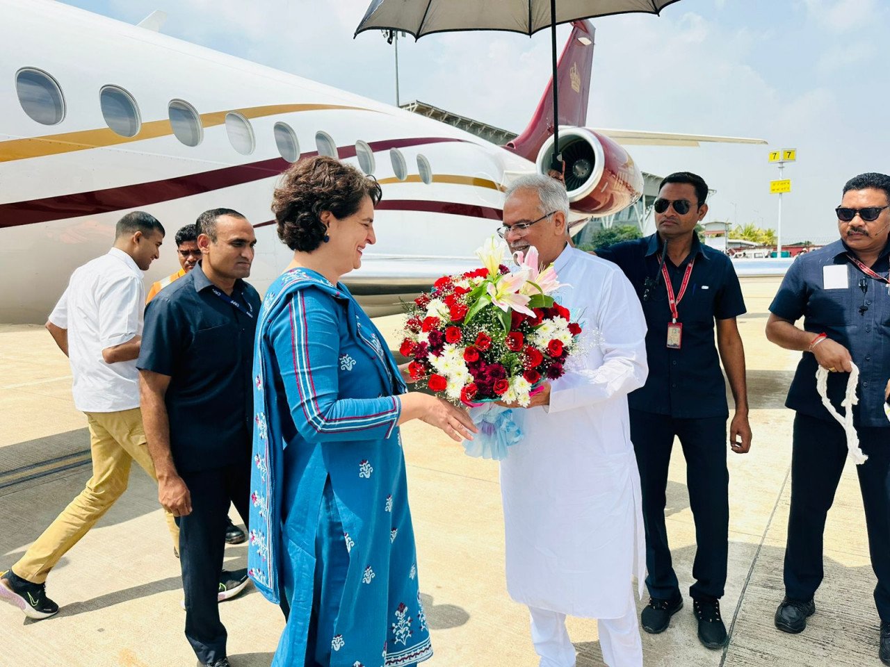 रायपुर : मुख्यमंत्री भूपेश बघेल और प्रियंका गांधी की हेलीपैड में किया गया आत्मीय स्वागत