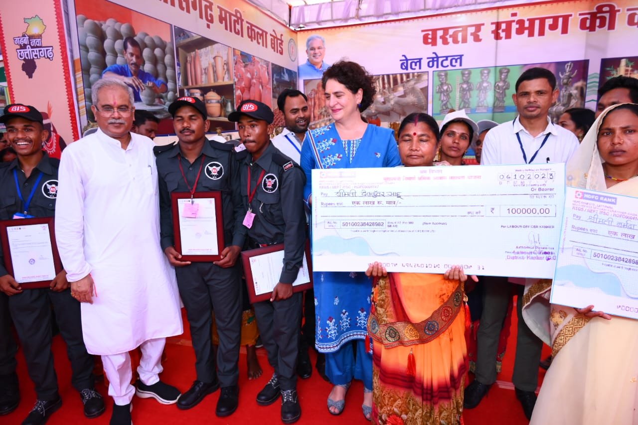 रायपुर : प्रियंका गांधी एवं मुख्यमंत्री भूपेश बघेल नगरीय निकाय एवं पंचायती राज महासम्मेलन परिसर में लगाए गए विभिन्न विभागीय स्टॉलों पर अवलोकन कर रहे हैं