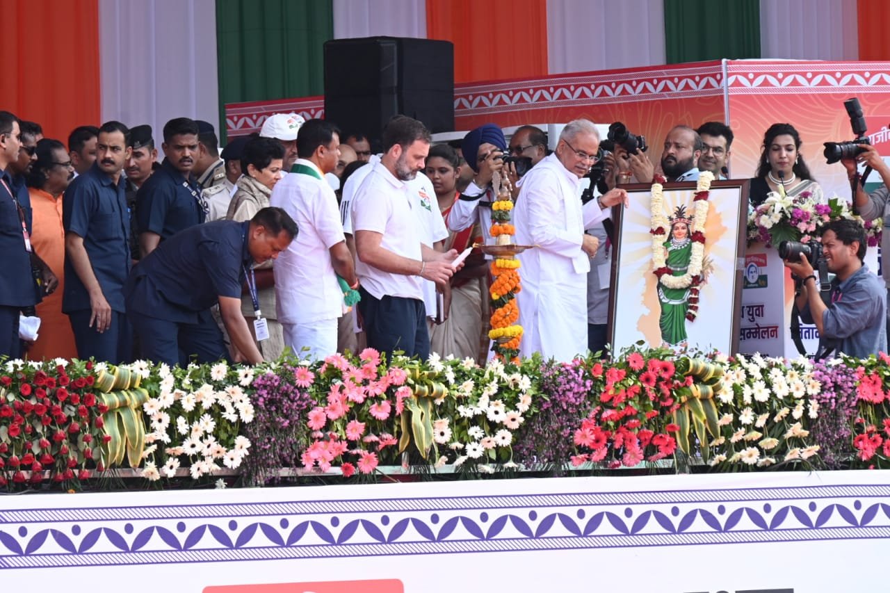 रायपुर : राजीव युवा मितान सम्मेलन : छत्तीसगढ़ महतारी के छायाचित्र में माल्यार्पण तथा राजगीत अरपा पैरी की धार के साथ कार्यक्रम की शुरूआत