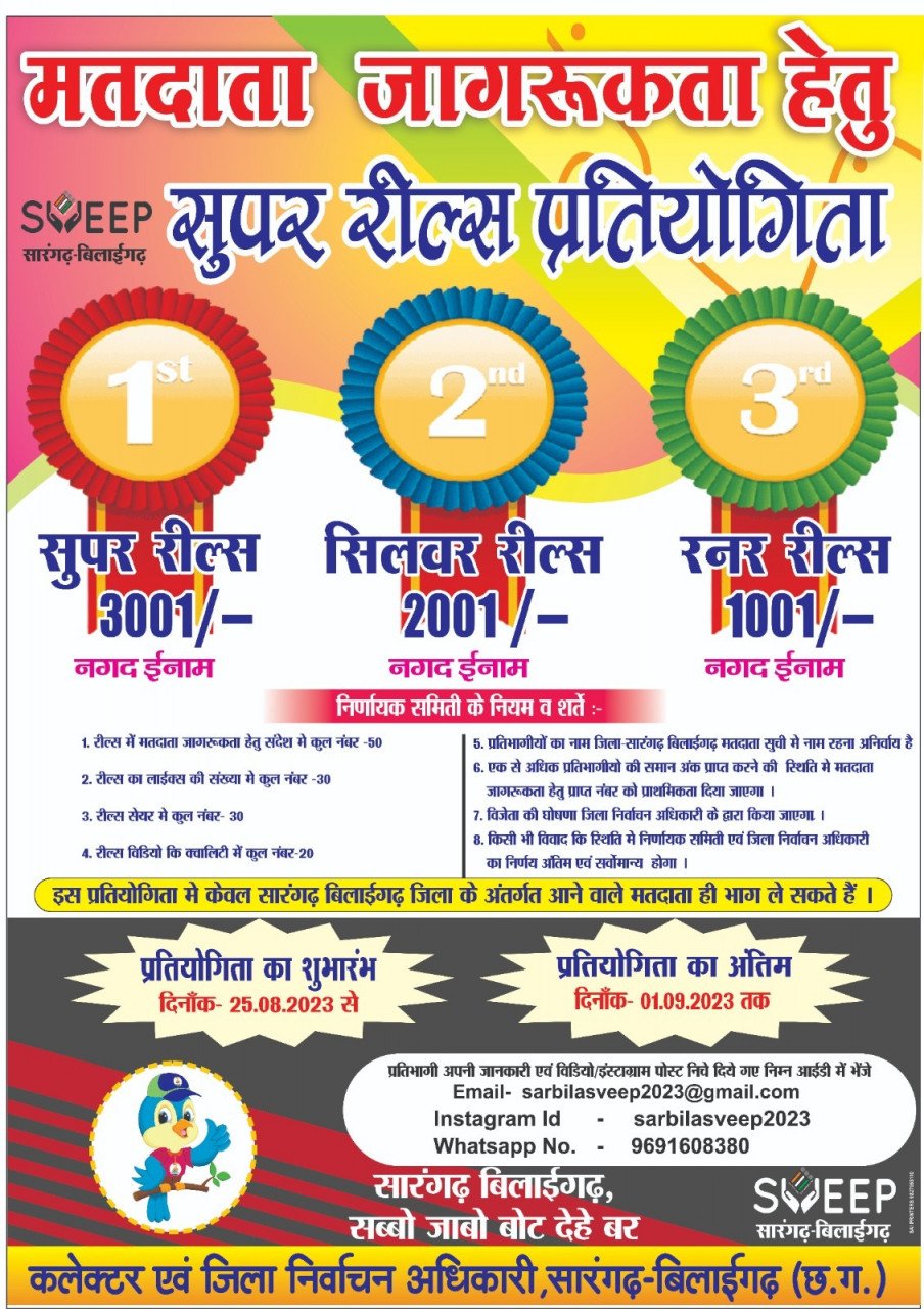 सारंगढ़ बिलाईगढ़ : मतदाता जागरूकता के लिए शार्ट वीडियो और सुपर रील्स प्रतियोगिता प्रारंभ : अंतिम तिथि 01 सितंबर