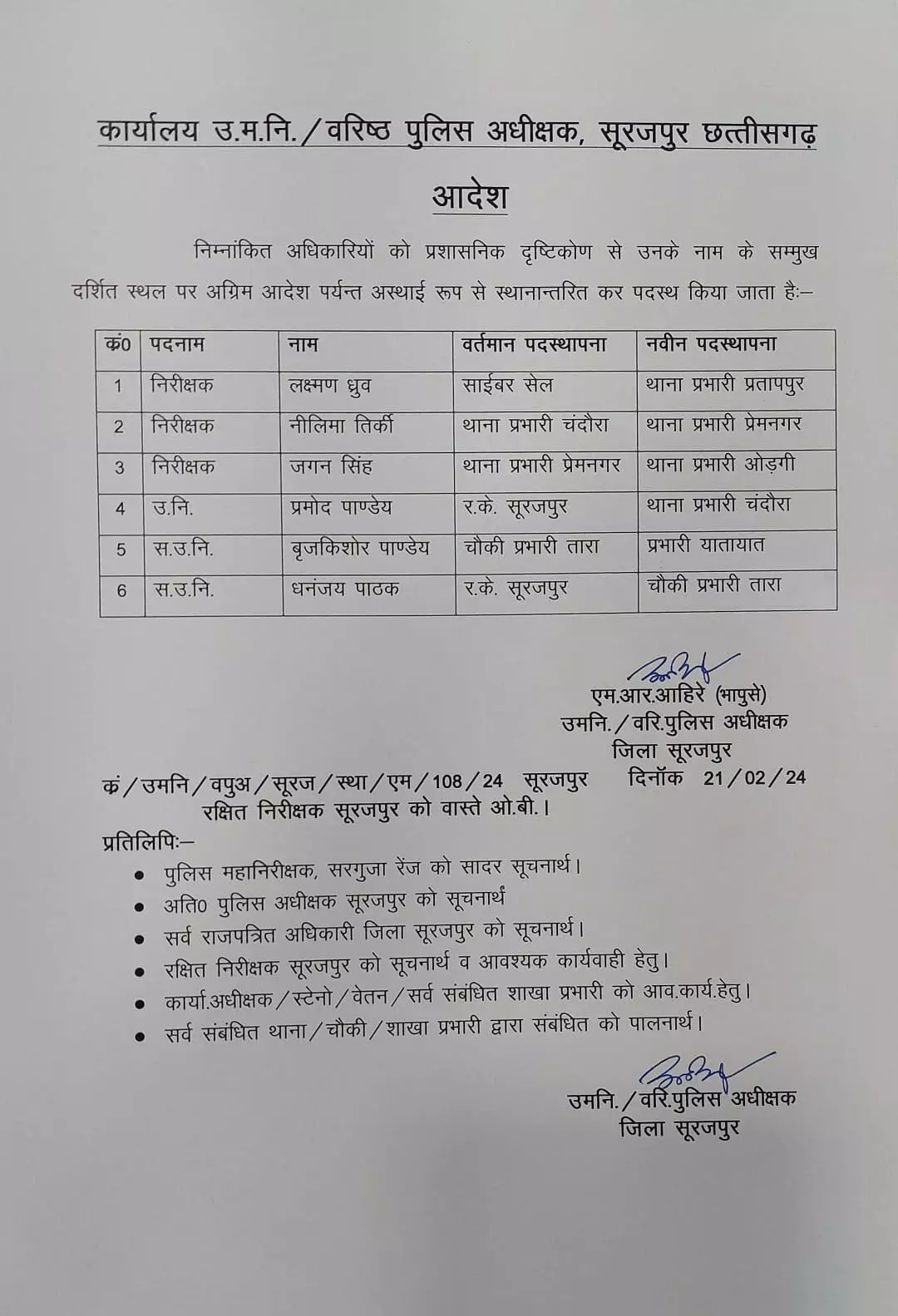 रायपुर बीते एक महीने से पुलिस विभाग में कई अधिकारियों का ट्रांसफर आदेश जारी हो रहा है। इसी बीच एक बार फिर सूरजपुर के पुलिस विभाग में बड़ी सर्जरी हुई है। एक साथ 6 थाना प्रभारियों का ट्रांसफर हुआ है। इस बाबत में नवपदस्त एसपी ने आदेश जारी किया। जारी आदेश के अनुसार लक्षमण ध्रुव का साइबर सेल से प्रतापुर के थाना प्रभारी नियुक्त किया गया है। निलिमा तिर्की को प्रेम नगर थाना प्रभारी बनाया गया है। इसके अलावा जगन सिंह को ओड़गी का थाना प्रभारी नियुक्त किया गया है। इतना ही नहीं प्रमोद पांडे को चंदौरा का थाना प्रभारी बनाया गया है।