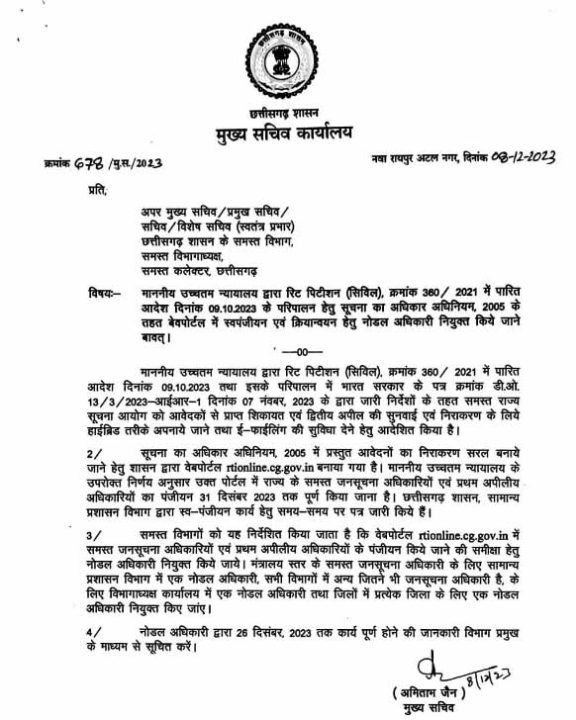 मुख्य सचिव ने समस्त विभागों को निर्देशित किया है कि वेबपोर्टल rtionline.cg.gov.in में सभी जनसूचना अधिकारियों एवं प्रथम अपीलीय अधिकारियों के पंजीयन किये जाने की समीक्षा हेतु नोडल अधिकारी नियुक्त किये जाये। मंत्रालय स्तर के समस्त जनसूचना अधिकारी के लिए सामान्य प्रशासन विभाग में एक नोडल अधिकारी, सभी विभागों में अन्य जितने भी जनसूचना अधिकारी है, के लिए विभागाध्यक्ष कार्यालय में एक नोडल अधिकारी तथा जिलों में एक जिला नोडल अधिकारी नियुक्त किए जाए। यह नियुक्ति 26 दिसंबर – 23 तक करना अनिवार्य होगा।