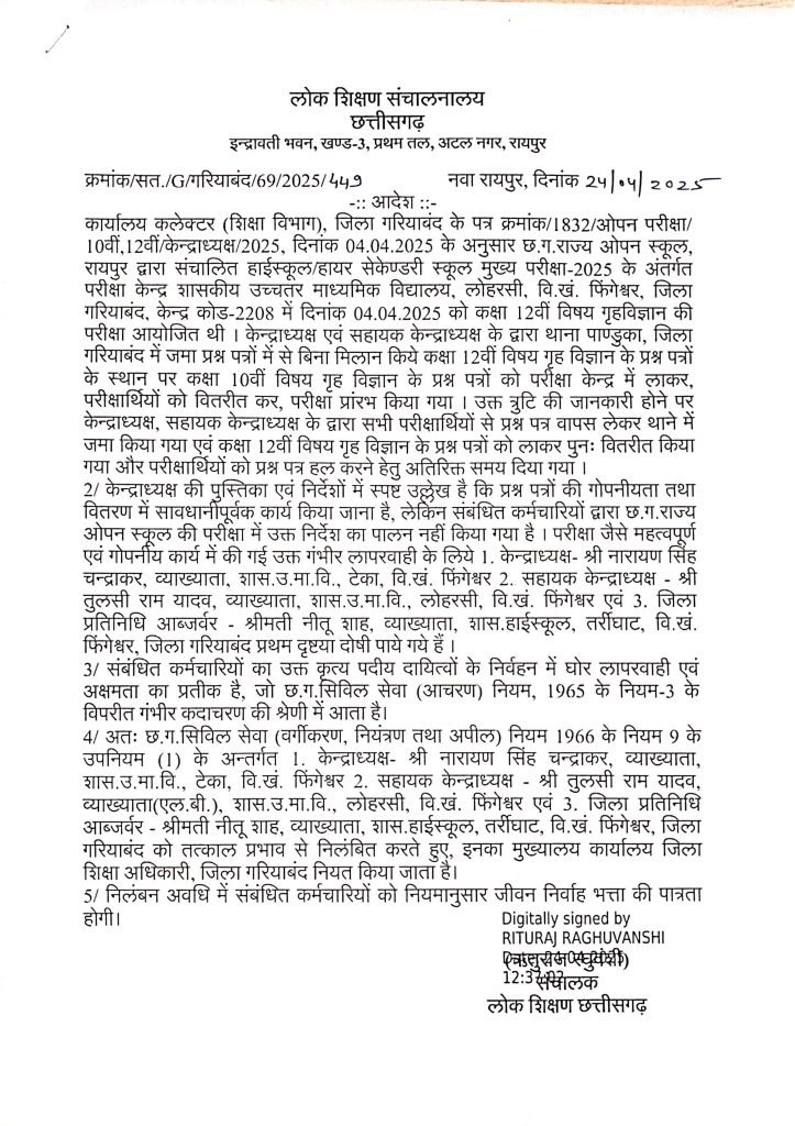 निलंबित अधिकारियों में केंद्राध्यक्ष नारायण सिंह चंद्राकर, सहायक केंद्राध्यक्ष तुलसी राम यादव और जिला प्रतिनिधि ऑब्जर्वर नीतू शाह शामिल हैं. निलंबन अवधि के दौरान सभी को जिला शिक्षा कार्यालय गरियाबंद में उपस्थिति देने के निर्देश दिए गए हैं.