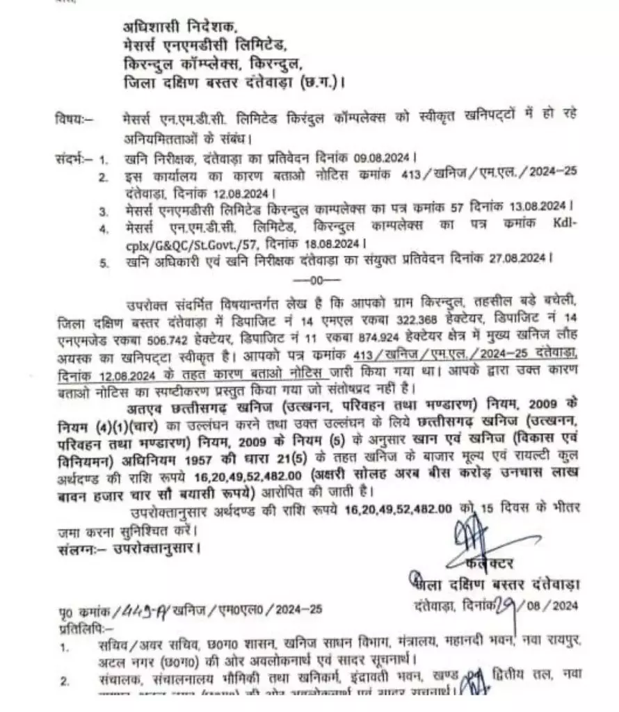 दंतेवाड़ा । दंतेवाड़ा कलेक्टर ने बड़ी कार्रवाई करते हुए नोटिस जारी कर एनएमडीसी किरंदुल को 1620 करोड़ रुपए का जुर्माना लगाया है। खनिज निरीक्षक के प्रतिवेदन के बाद एनएमडीसी प्रबंधन को कारण बताओ नोटिस जारी किया दया था। लेकिन नोटिस पर एनएमडीसी ने जो जवाब दिया था वह संतोषजनक नहीं रहा।
