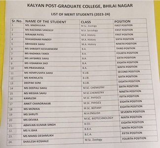 आगामी शैक्षिक गतिविधियों और पेशेवर कैरियर के लिए उचित मार्गदर्शन किया गया। भिलाई के सबसे प्रतिष्ठित शिक्षण संस्थानों में से एक कल्याण स्नातकोत्तर महाविद्यालय के 24 स्टूडेंट्स ने विश्वविद्यालय की मेरिट सूची में स्थान बनाया। शासकीय हेमचंद यादव विश्वविद्यालय द्वारा स्नातक और स्नातकोत्तर स्तर के कई पाठयक्रम के परीक्षा परिणामों को घोषित किया गया। इसमें कई प्राईवेट बडें़ महाविद्यालयों को पछाड़ते हुए कल्याण कॉलेज के 24 स्टूडेंट्स यूनिवर्सिटी की टॉप-टेन लिस्ट में स्थान प्राप्त किये हैं। कॉलेज प्रबंधन ने कहा हमारी उपलब्धि हैं