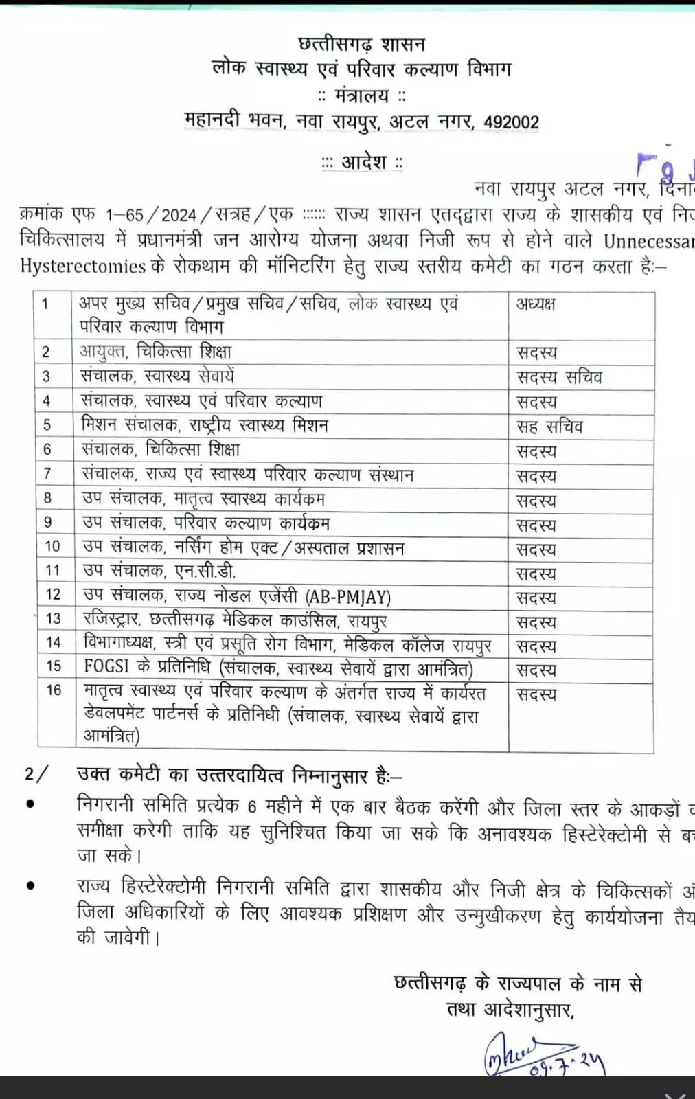 इस संबंध में शासन द्वारा आदेश जारी कर कहा कि राज्य शासन एतद्द्वारा राज्य के शासकीय एवं नि चिकित्सालय में प्रधानमंत्री जन आरोग्य योजना अथवा निजी रूप से होने वाले Unnecessary Hysterectomies के रोकथाम की मॉनिटरिंग हेतु राज्य स्तरीय कमेटी का गठन करता है। निगरानी समिति प्रत्येक 6 महीने में एक बार बैठक करेंगी और जिला स्तर के आकड़ों व समीक्षा करेगी ताकि यह सुनिश्चित किया जा सके कि अनावश्यक हिस्टेरेक्टोमी से बच जा सके। राज्य हिस्टेरेक्टोमी निगरानी समिति द्वारा शासकीय और निजी क्षेत्र के चिकित्सकों और जिला अधिकारियों के लिए आवश्यक प्रशिक्षण और उन्मुखीकरण हेतु कार्ययोजना तय की जाएगी ।