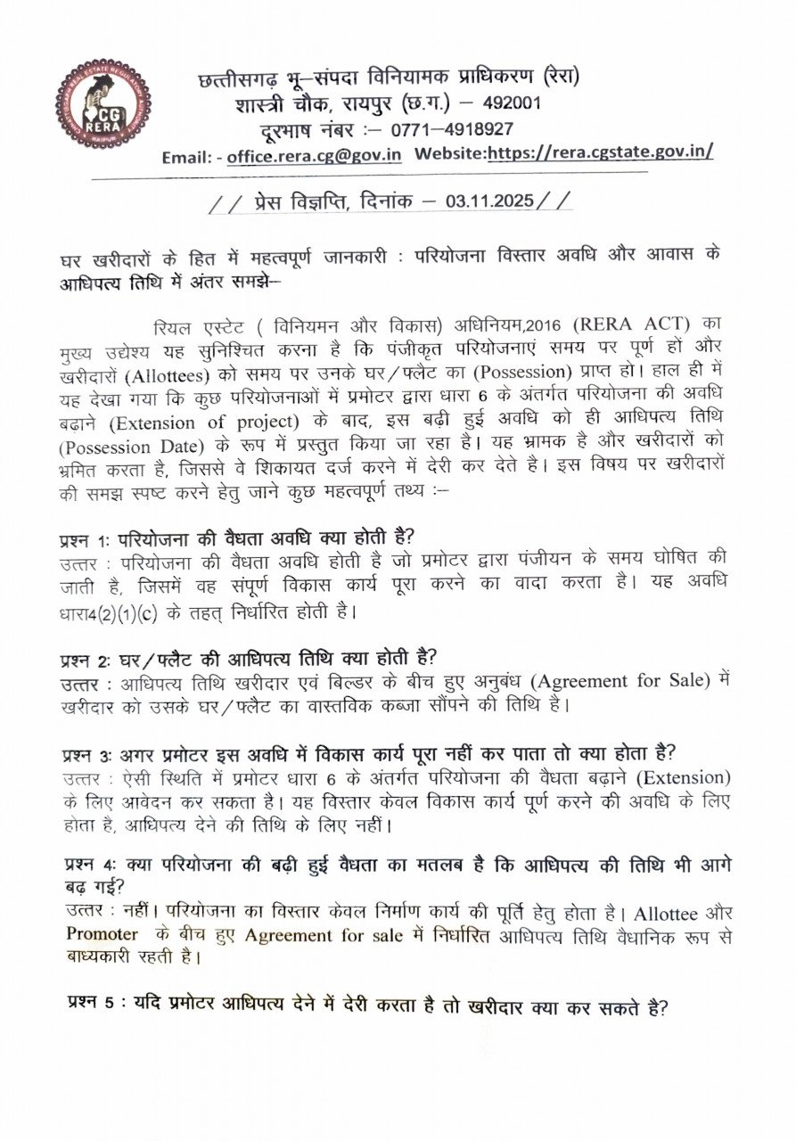 छत्तीसगढ़ भू-संपदा विनियामक प्राधिकरण (रेरा) ने घर खरीदारों (Allottees) के हित में महत्वपूर्ण जानकारी जारी करते हुए स्पष्ट किया है कि किसी परियोजना की विस्तार अवधि (Extension Period) और आधिपत्य तिथि (Possession Date) दोनों में अंतर होता है। रेरा ने कहा है कि परियोजना की अवधि बढ़ाए जाने का अर्थ यह नहीं है कि खरीदार को संपत्ति देने की निर्धारित तिथि भी बढ़ गई है।