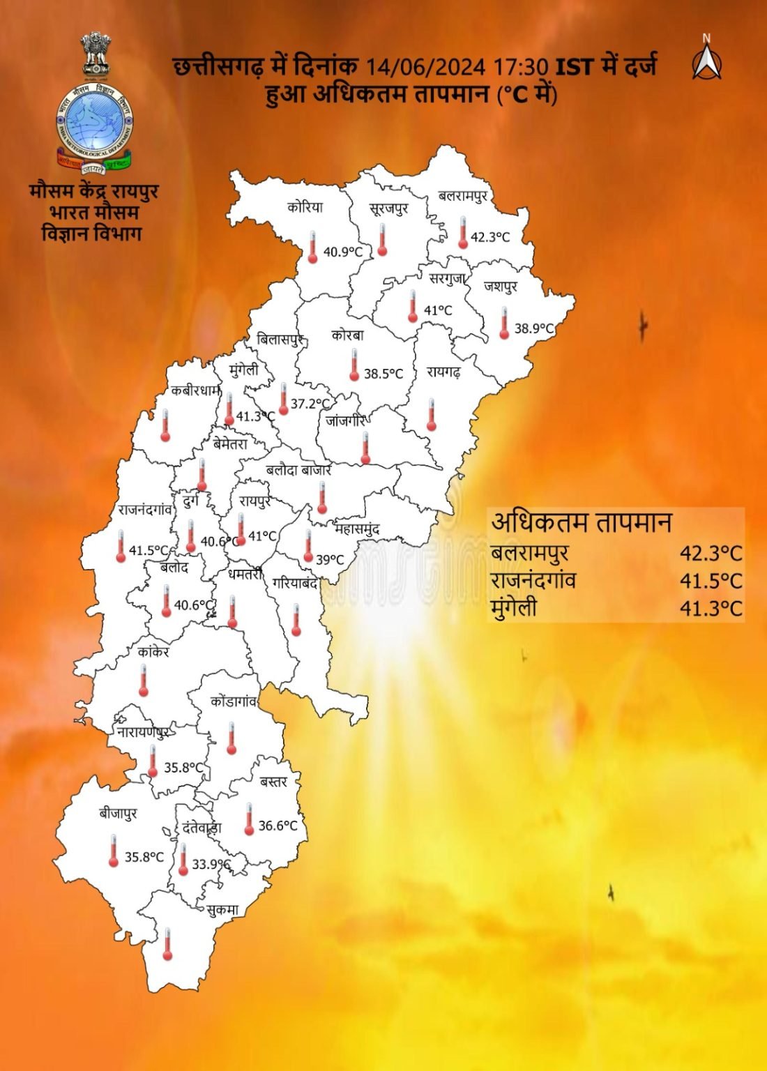 वहीं प्रदेश के कई जिलों में को अधिकतम तापमान सामान्य से अधिक रहा, जिससे लोगों को काफी गर्मी और उमस का सामना करना पड़ा. सबसे अधिकतम तापमान बलरामपुर में 42.6 डिग्री दर्ज किया किया गया. वहीं वहीं सबसे कम तापमान नारायणपुर में 22.7 डिग्री दर्ज किया गया. रायपुर में तापमान 40 डिग्री, अंबिकापुर में 41 डिग्री, जगदलपुर में 36.6 डिग्री और बिलासपुर में 37.2 डिग्री रिकॉर्ड किया गया.