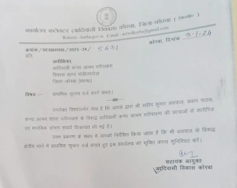 बता दें कि कुछ दिनों पहले ग्राम घरीपखना के प्रीमेट्रिक आदिवासी छात्रावास में दो बच्चियों ने शिक्षक पर छेड़छाड़ का आरोप लगया था. अधिक्षिका की शिकायत पर आदिवासी विकास कोरबा ने जांच टीम गठित कर जांच के बाद दोषी पाए जाने पर शिक्षक संदीप अग्रवाल को निलंबित किया गया था. इस मामले में अब आदिवासी विकास कोरबा के सहायक आयुक्त ने दोषी शिक्षक पर स्थानीय थाना कटघोरा में एफआईआर दर्ज करने का आदेश जारी किया है.