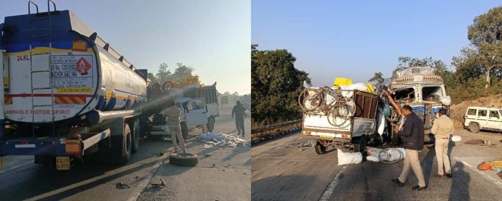 कोरबा. छत्तीसगढ़ के बिलासपुर-अंबिकापुर मार्ग के मोरगा थाना क्षेत्र में आज सुबह-सुबह एक भीषण सड़क हादसा हो गया. तारा घाटी के पास पिकअप वाहन और डीजल ट्रक की आमने-सामने हुई जोरदार भिड़ंत में पिकअप ड्राइवर की घटनास्थल पर ही मौत हो गई. हादसे में पिकअप में सवार चार अन्य लोग गंभीर रूप से घायल हो गए, जबकि ट्रक ड्राइवर को भी चोटें आई हैं. राहत की बात यह रही कि इस दुर्घटना में गाड़ियों में कोई आग नहीं लगी. डीजल टैंक में डीजल होने से बड़ी आगजनी भी होने की संभावना थी, जो टल गई.
