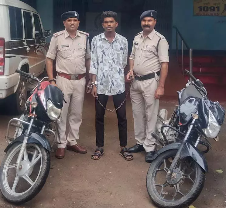 धमतरी। ग्राम दर्री और अभनपुर मे बाइक चोरी करने वाले आरोपी को कुरूद पुलिस ने गिरफ्तार किया है। रविकांत साहू पिता अंजोर साहू साकिन दर्री थाना कुंरूद द्वारा दिनांक 27-06-24 को रात्रि में अपने मकान के सामने मो०सा० डिस्कवर कमांक सीजी 05 डब्लू 7025 को खड़ी किया था, जिसे सुबह उठकर देखा तो कोई अज्ञात व्यक्ति द्वारा मो०सा० को चोरी कर ले गया था जिसको अपने आस पास,मित्र रिस्तेदार को पूछा,जब मो०सा० कहीं नही मिलने पर की सूचना पर थाना कुरूद में अप० क्रं 325/24 धारा 379 भादवि.के तहत अपराध कायम कर विवेचना में लिया गया था। जिसके पता तलाश हेतु थाना कुरूद के अधिकारी कर्मचारी एवं सायबर सेल अधिकारी कर्मचारी की संयुक्त टीम द्वारा घटनास्थल पर लगे सीसीटीवी कैमरा के फुटेज, मुखबीर सूचना पर एवं आसपास पता तलाश करने पर मुखबिर सूचना मिला कि एक व्यक्ति छ०गо ढाबा के पास मो०सा० बेचने के लिए ग्राहक की तलाश कर रहा है एवं लोगों से चर्चा कर रहा है। जिस सूचना पर तत्काल पुलिस टीम द्वारा मौके पर पहुंचकर संदेही हेमसागर ध्रुव पिता हेमंत ध्रुव उम्र 20 वर्ष ग्राम गुजरा थाना भखारा से कड़ाई से पूछताछ करने पर बताया कि दिनांक 27.06.2024 को ग्राम दर्री से मो०सा० डिस्कवर CG 05 W 7025 को चोरी करना एवं दिनांक 12.06.24 को ग्राम सारखी प्रवेश द्वार अभनपुर के पास एचएफ डिलक्स कमांक CG 04 MM 2580 के साथ मो०सा० के हैंडल में टंगी पैंट के जेब में रखी नगद 5000/- रू एक जीयो कंपनी के मोबाईल को चोरी कर वहा से भागना एवं रास्ते में मोबाईल को नहर में फेकना बताया गया। मो०सा० डिस्कवर CG 05 W 7025 को चोरी कर उपयोग कर रहा था एवं एचएफ डिलक्स क्रमांक CG 04 MM 2580 को घर में छुपाकर रखना बताया। एचएफ डिलक्स क्रमांक CG 04 MM 2580 का थाना अभनपुर क्षेत्र में चोरी गये दोनों मोटर सायकिल को जब्त कर आरोपी कोविधिवत गिरफ्तार कर न्यायिक रिमांड में भेजा जा रहा है। आरोपी का नाम हेमसागर ध्रुव पिता हेमंत ध्रुव उम्र 20 वर्ष ग्राम गुजरा थाना भखारा