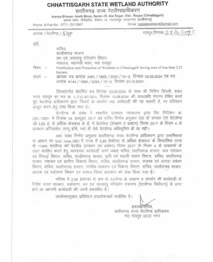 रायपुर। छत्तीसगढ़ वेटलैंड अथॉरिटी की कार्य प्राणी को उजागर करते हुए रायपुर के नितिन सिंघवी ने आरोप लगाया है कि आद्र्भूमियों के संरक्षण के लिए बनी वेटलैंड अथॉरिटी प्रदेश के बड़े तालाबों को बचा नहीं पा रही है और छोटे तालाबों को मरने के लिए छोड़ दिया है। वर्ष 2017 में सर्वोच्च न्यायालय के आदेश के उपरांत 2.25 हेक्टर से ऊपर के तालाबों और आद्रभूमियों पर वेटलैंड संरक्षण के लिए प्रतिबंधित कार्यो के नियम लागू होते हैं परंतु 2.25 से छोटे तालाबों पर यह नियम इसलिए लागू नहीं हो पाए क्योंकि ये छोटे तालाब चिन्हित कर अधिसूचित नहीं किए गए हैं।