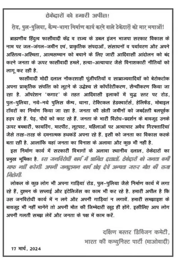 सुकमा सडक़,पुल-पुलिया, कैम्प,थाना निर्माण करने वाले ठेकेदारों को नक्सलियों ने प्रेसनोट जारी कर चेतावनी दी है। जारी प्रेसनोट में ठेकेदारों को मौत की सजा देने की नक्सलियों ने बात लिखी है। नक्सलियों की दक्षिण बस्तर डिविजऩ कमेटी ने ठेकेदारों के चेतावनी पत्र जारी किया। स्थानीय लोगों को अपनी गाड़ियां, सडक़, पुल पुलिया जैसे कार्यों में न लगाने की चेतावनी भी दी।