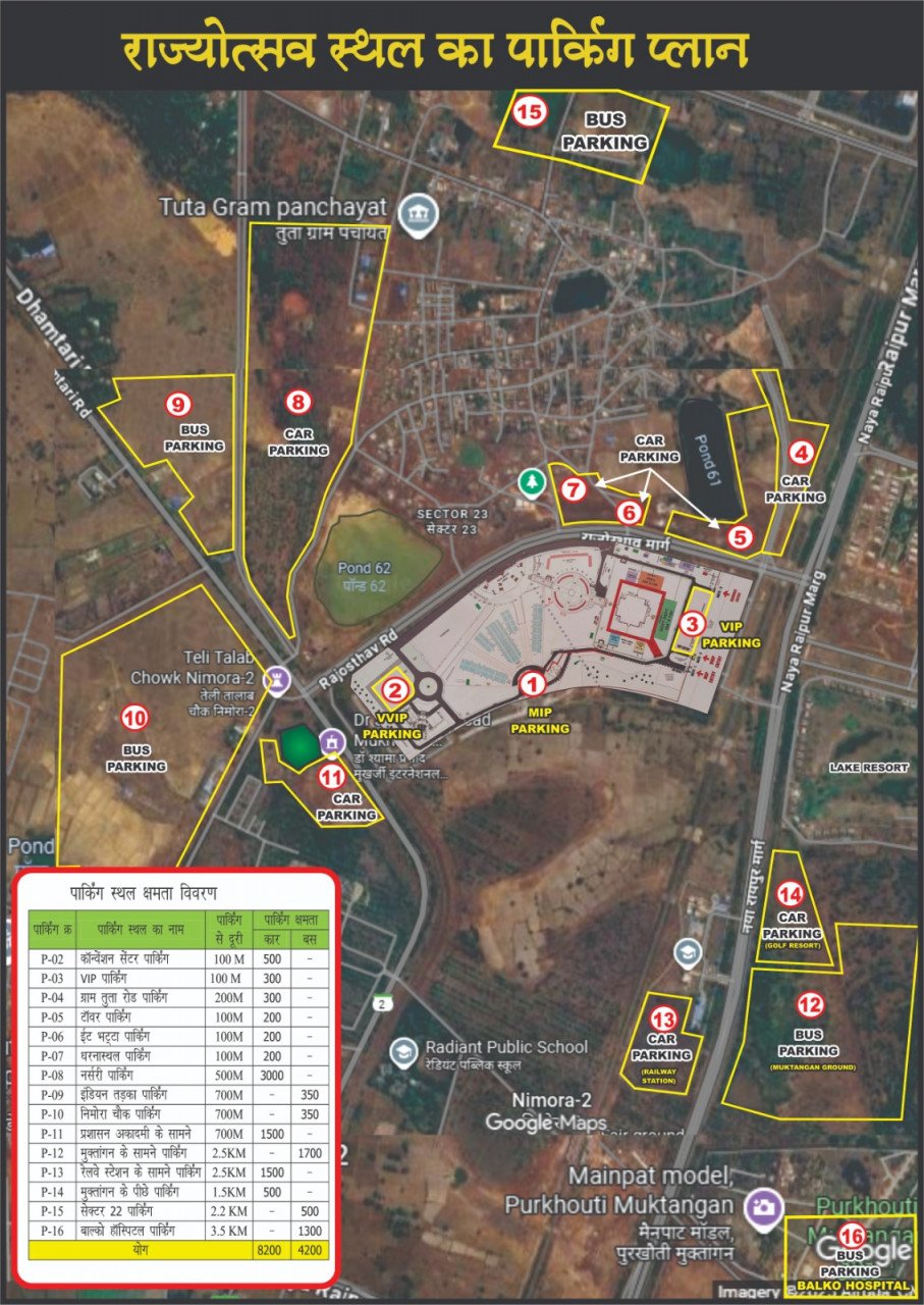 दोपहिया वाहनों की पार्किंग राज्योत्सव स्थल के सामने धरना स्थल के दोनों तरफ स्थित पार्किंग स्थल पी-05, पी-06 एवं पी-07 में होगी।