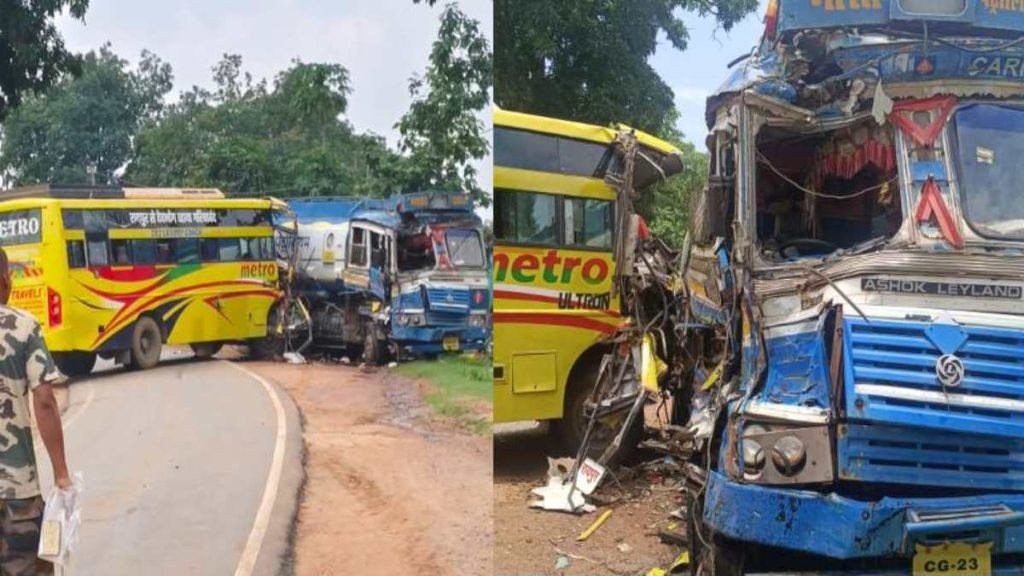 जानकारी के अनुसार,गरियाबंद-देवभोग नेशनल हाईवे 130 सी मुख्य मार्ग पर यात्री बस और भारत पेट्रोलियम के टैंकर के बीच भीषण टक्कर हो गई. भीषण हादसे में दोनों वाहनों के चालक सहित 7 लोग घायल हो गए. हादसा इंदागांव और कोयबा के बीच हुआ है.