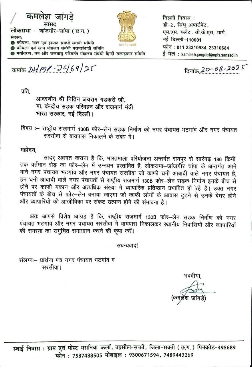 इसी चिंता को ध्यान में रखते हुए सांसद कमलेश जांगड़े ने पत्र लिखकर नितिन गडकरी से आग्रह किया है कि भटगांव और सरसीवा में बायपास निकाला जाए ताकि स्थानीय निवासियों और व्यापारियों की समस्याओं का समाधान हो सके। इस अवसर पर पूर्व नेता प्रतिपक्ष नारायण चंदेल भी उनके साथ मौजूद रहे।