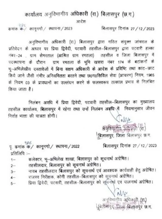 एसडीएम ने जांच के लिए कमेटी गठित की थी, जिसनें जांच में छग सिविल सेवा आचरण नियम के प्रावधानों का उल्लंघन पाया, जिसके बाद निलंबन की कार्रवाई की गई. निलंबन अवधि में महिला पटवारी का मुख्यालय बिलासपुर तहसील होगा.