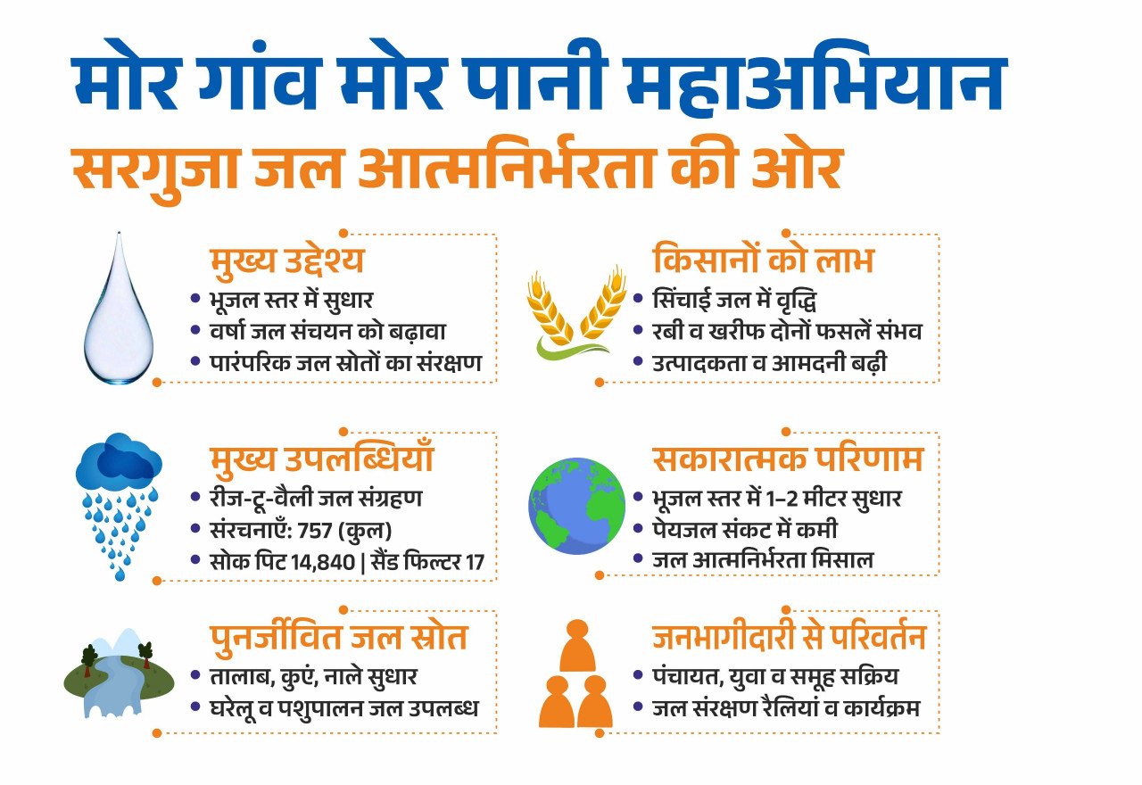 मोर गांव मोर पानी महा अभियान के चलते जिले में कई स्थानों पर भू-जल स्तर में 1 से 2 मीटर तक सुधार दर्ज किया गया है। पहले जिन गांवों में गर्मी के मौसम में पेयजल संकट था, वहां अब हैंडपंप और कुएं सुचारू रूप से चल रहे हैं। शासन का लक्ष्य है कि आने वाले वर्षों में जिले के प्रत्येक गांव में पर्याप्त जल संरचनाएं निर्मित हों, ताकि सरगुजा जल आत्मनिर्भर जिला के रूप में विकसित हो सके।