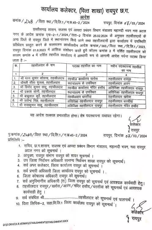 रायपुर सामान्य प्रशासन विभाग ने रायपुर जिले में नवीन अधिकारियों की नवीन पदस्थापना के बाद नए सिरे से कार्यों का विभाजन किया है. इसके साथ ही अन्य जिले से रायपुर जिले में स्थानांतरण किए गए तहसीलदारों को जिले के विभिन्न तहसील कार्यालय में अस्थायी रूप से पदस्थ किया गया है.