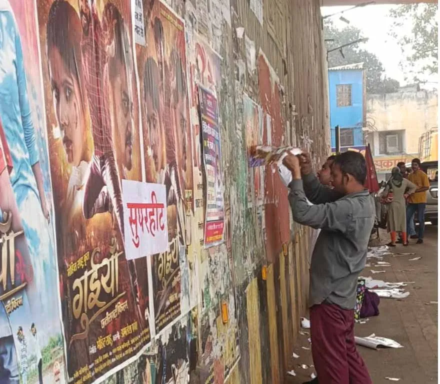 रायपुर नगर निगम की दो टीमों द्वारा पचपेड़ी नाका ओवरब्रिज के नीचे फिल्मी पोस्टर लगाकर दीवारों की दुर्दशा करने वाले एक फिल्म के दो निर्माताओं पर सम्पत्ति विरूपण अधिनियम के तहत 15 हजार रुपए का जुर्माना लगाया गया। साथ ही पोस्टरों को दीवारों से रगड़ – रगड़ कर निकाल कर सफाई की गई।