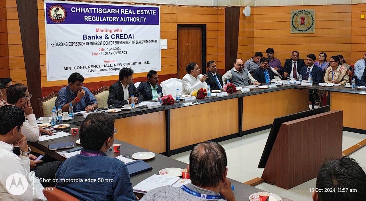 रायपुर, छत्तीसगढ़ भू-संपदा विनियामक प्राधिकरण (रेरा) ने रियल एस्टेट प्रोजेक्ट्स में बैंक खातों की पारदर्शिता सुनिश्चित करने के उद्देश्य से अधिसूचित बैंक अधिकारियों एवं बिल्डर्स के संगठन (क्रेडाई) के सदस्यों के साथ आज स्थानीय न्यू सर्किट हाऊस में संयुक्त बैठक किया गया। बैठक में रेरा के अध्यक्ष संजय शुक्ला, सेंट्रल बैंक ऑफ इंडिया के कार्यपालक निदेशक महेन्द्र डोहरे, पंजाब नेशनल बैंक के जोनल मैनेजर और 28 राष्ट्रीयकृत और निजी बैंकों के अधिकारी, साथ ही क्रेडाई (रायपुर और बिलासपुर) के सदस्य शामिल हुए।