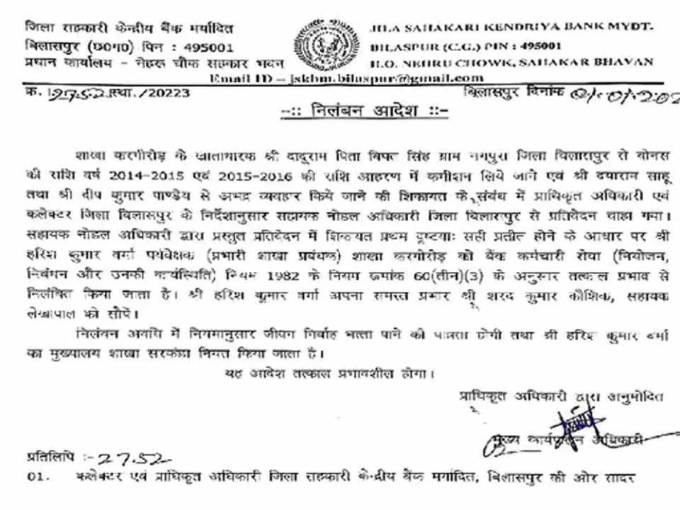 बिलासपुर में किसानों का बकाया बोनस देने के एवज में कमीशन मांगने पर कलेक्टर अवनीश शरण ने ब्रांच मैनेजर हरीश कुमार वर्मा को सस्पेंड कर दिया है। 25 दिसंबर को मुख्यमंत्री विष्णुदेव साय ने किसानों के खातों में दो साल के बकाया बोनस की राशि जारी किया था। पूरा मामला करगीरोड शाखा का है।