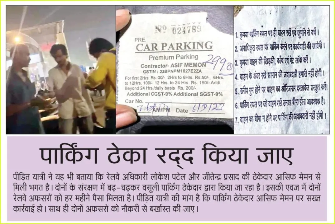 रायपुर। यदि आप रेल से सफर करने जा रहे है और गाड़ी पार्किंग में रखना चाहते है तो सतर्क हो जाइए। क्योंकि रायपुर रेलवे स्टेशन में पार्किंग के नाम पर खुलेआम लूट मचा रखा है। यदि किराया को लेकर हर रोज गाड़ी बेइज्जत होना पड़ता है। यहां पर वही होता है जो ठेकेदार के गुर्गे चाहते है।