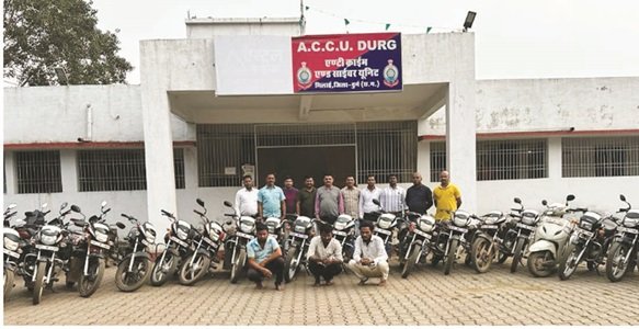 भिलाई जिले में लगातार वाहन चोरी की घटनाएँ घटित हो रही थी जिसे अत्यंत ही गंभीरता से लेते हुए वरिष्ठ पुलिस अधीक्षक रामगोपाल गर्ग के द्वारा वाहन चोरी के मामलों में त्वरित कार्यवाही करते हुए आरोपियों की शीघ्र पतासाजी एवं माल बरामदगी हेतु निर्देश प्राप्त हुए थे, जिसके परिपालन में अतिरिक्त पुलिस अधीक्षक शहर अभिषेक झा, अतिरिक्त पुलिस अधीक्षक अपराध डॉ.अनुराग झा, नगर पुलिस अधीक्षक दुर्ग मणीशंकर चंद्रा के मार्गदर्शन में एसीसीयू प्रभारी निरीक्षक नरेश पटेल, निरीक्षक संतोष मिश्रा, थाना प्रभारी मोहन नगर निरीक्षक विजय यादव, थाना प्रभारी पुलगांव निरीक्षक तापेश्वर नेताम, थाना प्रभारी पद्यमनाभपुर निरीक्षक अनिल साहू के नेतृत्व में एसीसीयू एवं थानों की एक संयुक्त टीम गठित कर टीम को कार्यवाही हेतु लगाया गया था। टीम द्वारा संदेहियों पर सतत् निगाह रखी जा रही थी, विशेष सूत्र भी लगाये गये थे। जेल से रिहा हुए पूर्व के आदतन अपराधियों पर भी निगाह रखी जा रही थी। इसी दौरान विशेष सूत्रों से पता चला कि न्यू आदर्श नगर दुर्ग निवासी मुख्तार अहमद, अपने साथी शंकर नगर दुर्ग निवासी शेख सलीम के साथ मिलकर चोरी की मोटर सायकल बेचने के लिए ग्राहक की तलाश में लगा है कि सूचना पर टीम द्वारा मुख्तार अहमद एवं शेख सलीम को मोहन नगर क्षेत्र में घेराबंदी कर पकड़ा गया। प्रारंभिक पूछताछ पर गुमराह करता रहा किन्तु सतत् एवं तथ्यात्मक पूछताछ करने से दोनों ने मिलकर दुर्ग जिले के थाना मोहन नगर, पुलगांव एवं पद्यमनाभपुर क्षेत्रांतर्गत स्थित शराब भट्टीयों के पास से पिछले एक वर्ष के दौरान अलग-अलग समयावधि में कुल 22 वाहनों के चोरी की घटनाओं को अंजाम देना स्वीकार किया। चोरी की गयी वाहनों को बेचने के लिए अपने साथी हनोदा दुर्ग निवासी मोहम्मद बेग उर्फ गोलू जो कि पेषे से भवन निर्माण ठेकेदारी का कार्य करता है के पास बेचना बताया। जिस पर मोहम्मद बेग को पकड़कर पूछताछ करने पर उपरोक्त मोटर सायकलों को अपने पास कार्यरत् मजदूरों को चलाने हेतु देना बताया। आरोपियों के निशानदेही पर 01 नग एक्टिवा, 03 नग स्प्लेण्डर व 18 नग एच एफ डिलक्स मोटर सायकल जुमला कीमती 14.70 लाख रू. की मशरूका को बरामद कर जप्त किया गया। अग्रिम कार्यवाही संबंधित थानों से की जा रही है।