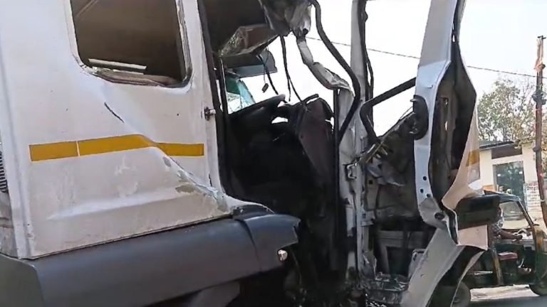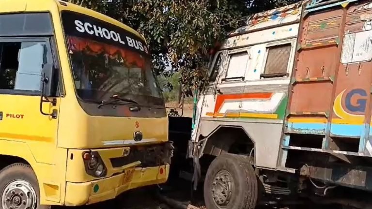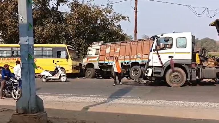 खड़ी स्कूल बस और ट्रक को ट्रेलर ने मारी टक्कर
