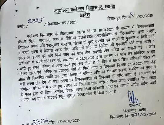 बिलासपुर। कलेक्टर अवनीश शरण के निर्देश पर भ्रष्टाचार के खिलाफ दो पर कठोर कार्रवाई हुई है, रिश्वत की मांग करने वाला शिक्षा विभाग का क्लर्क निलंबित हुआ है, इसी के साथ BEO हटाए गए और विभागीय जांच के आदेश कलेक्टर ने दिए है। बता दें कि मृत शिक्षक के स्वत्व के भुगतान के लिए 1.24 लाख रिश्वत मांग रहा था, कलेक्टर के निर्देश पर शिकायत की जांच हुई, जांच में शिकायत सही पाई गई, बीईओ और बाबू मिलकर मृत शिक्षक की पत्नी को परेशान कर रहे थे, मृत शिक्षक की पत्नी स्वयं सहायक शिक्षक है, कलेक्टर से कर्मचारी जनदर्शन में शिकायत की थी।