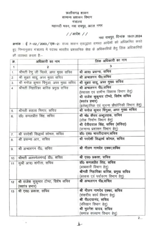 रायपुर।  अवकाश के दिनों में एक दूसरे के विभागीय कार्यों के लिए 27 आला सचिवों के लिंक अफसर नियुक्त किए गए हैं। यह आदेश सामान्य प्रशासन विभाग ने जारी किया है।