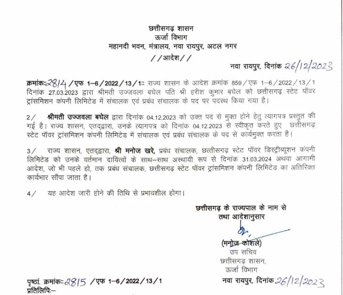 सीजी पॉवर ट्रांसमिशन कंपनी की एमडी उज्जवला बघेल ने इस्तीफा दे दिया है। उन्होंने तीन दिसंबर को चुनावी नतीजे आने के बाद अगले ही दिन सचिव उर्जा को इस्तीफा भेज दिया था। पिछले वर्ष एमडी बनने के बाद से बघेल एक्सटेंशन पर सेवारत थीं। राज्य सरकार ने इस्तीफा मंजूर करते हुए एमडी डिस्ट्रीब्यूशन कंपनी मनोज खरे को अतिरिक्त प्रभार सौंपा है। खरे का भी कार्यकाल खत्म हो गया है और सरकार ने मार्च तक एक्सटेंशन दिया है। यह दोनों आदेश कल जारी किए गए हैं।