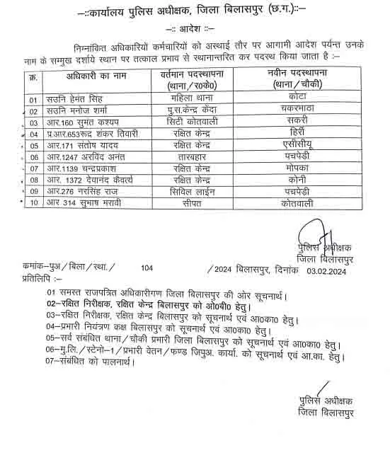 बिलासपुर। पुलिस विभाग में तबादले का आदेश जारी किया गया है. जिसमें 2 एएसआई, 1 प्रधान आरक्षक और 7 आरक्षकों का नाम शामिल है. जिसका आदेश एसपी संतोष सिंह ने जारी किया है.