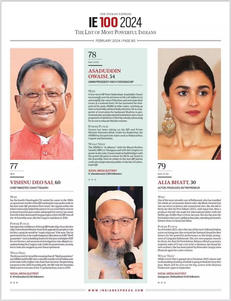 रायपुर मुख्यमंत्री श्री विष्णु देव साय 100 प्रभावशाली लोगों की लिस्ट में बनाई जगह छत्तीसगढ़ के पहले आदिवासी मुख्यमंत्री विष्णुदेव साय बहुत कम समय में ही लोकप्रियता की सीढ़ी चढ़ने लगे हैं। मुख्यमंत्री ने अपने दो महीने के कार्यकाल में ही मोदी की गारंटी लागू करने सहित कई उपलब्धियों से जनता के दिल में जगह बना ली है। सीएम साय अपने इस छोटे से कार्यकाल में न केवल आदिवासियों का बल्कि आम जनता का विश्वास जीतने में सफल हुए हैं। यही वजह है कि इंडियन एक्सप्रेस द्वारा जारी देश के 100 प्रभावशाली लोगों की सूची में मुख्यमंत्री विष्णुदेव साय 77वें नंबर पर काबिज हैं।