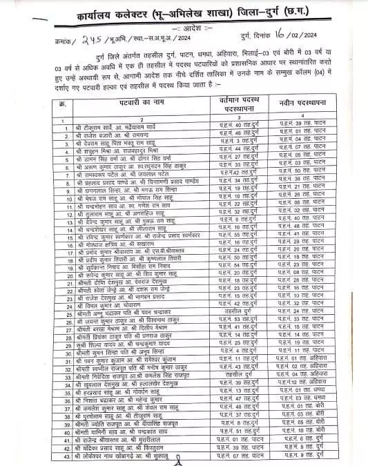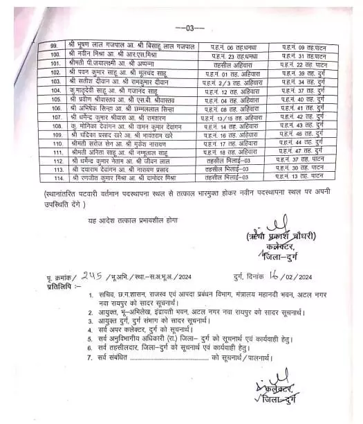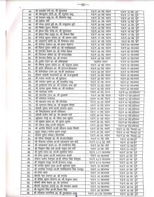 Home » CG : 100 से ज्यादा पटवारियों का ट्रांसफर, देखें लिस्ट… छत्तीसगढ़ दुर्ग CG : 100 से ज्यादा पटवारियों का ट्रांसफर, देखें लिस्ट… by kgnews 17/02/2024 दुर्ग जिले में पदस्थ 114 पटवारियों के तबादले किये गए है। लिस्ट में जिनके नाम है, वो इस प्रकार है… kgnews Related Posts छतरपुर के डायल-112 हीरोज पिकअप पलटने से घायल 08 व्यक्तियों को त्वरित सहायता से पहुँचाया अस्पताल Admin 28/04/2026 राज्यपाल रमेन डेका ’प्लेसमेंटनामा’ के समापन समारोह में हुए शामिल, समारोह में युवाओं को दी सफलता की सीख Admin 28/04/2026 जिला प्रशासन की अनूठी पहल, नहरों के पानी से लबालब हुए 450 तालाब Admin 28/04/2026 युवा फेस्ट 2026 का सकारात्मक असर Admin 28/04/2026