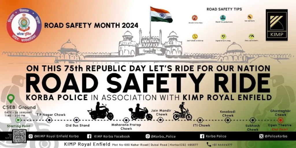 कोरबा 26 जनवरी की शाम जिले की पुलिस ‘रोड सेफ्टी बाइक रैली’ निकालेंगी। अधिकारी ने अधिक जानकारी देते बताया कि यह रैली CSEB ग्राउंड से शुरू होगी और हम TP नगर, पुराने बस स्टैंड, महाराणा प्रताप चौक, आईटीआई चौक से होकर और फिर घंटाघर के ओपन एयर थिएटर में समाप्त होगी। इस महत्वपूर्ण क्षण में हमें आपके साथ देखने का सतर्कता और सुरक्षा के प्रति प्रतिबद्धता की आवश्यकता है।