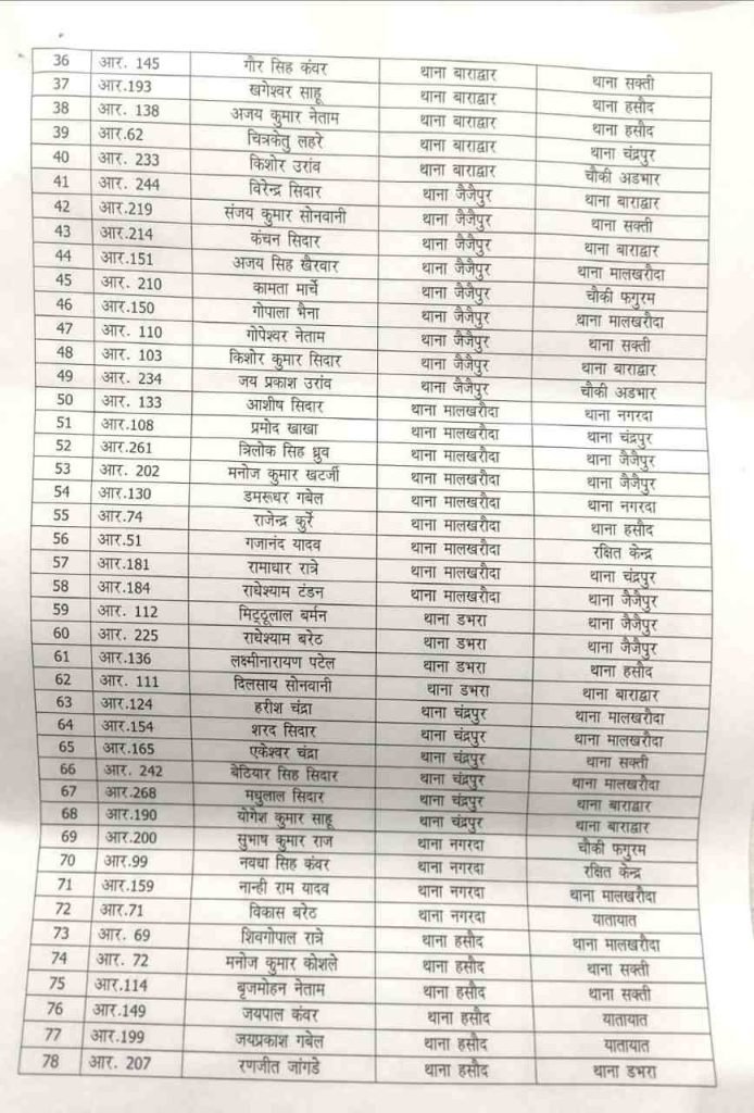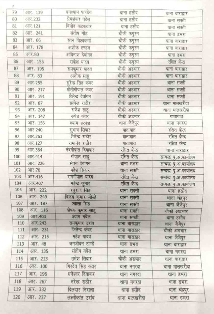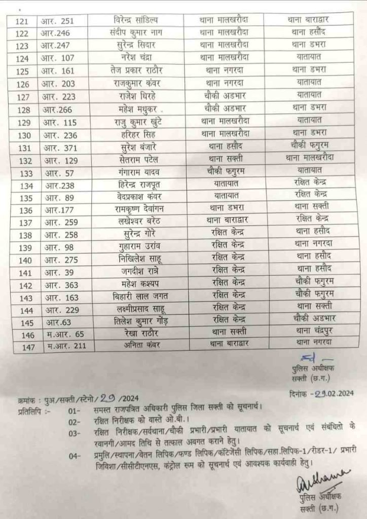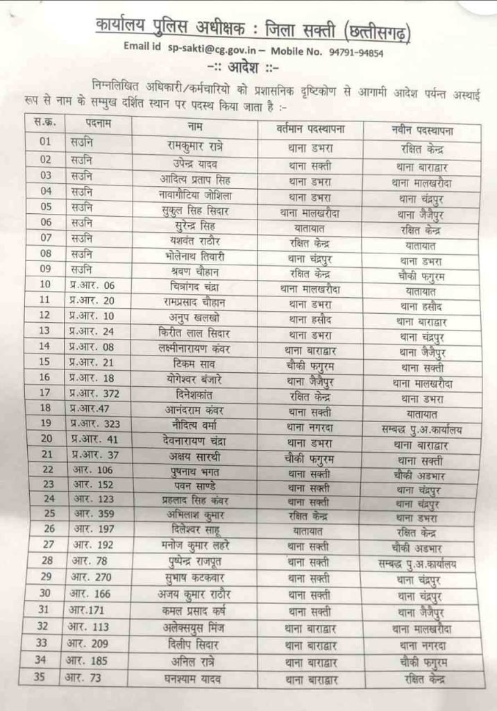 सक्ती जिले की नवपदस्थ एसपी अंकिता शर्मा ने 9 एएसआई, 12 प्रधान आरक्षक, और 126 आरक्षकों का तबादला किया है