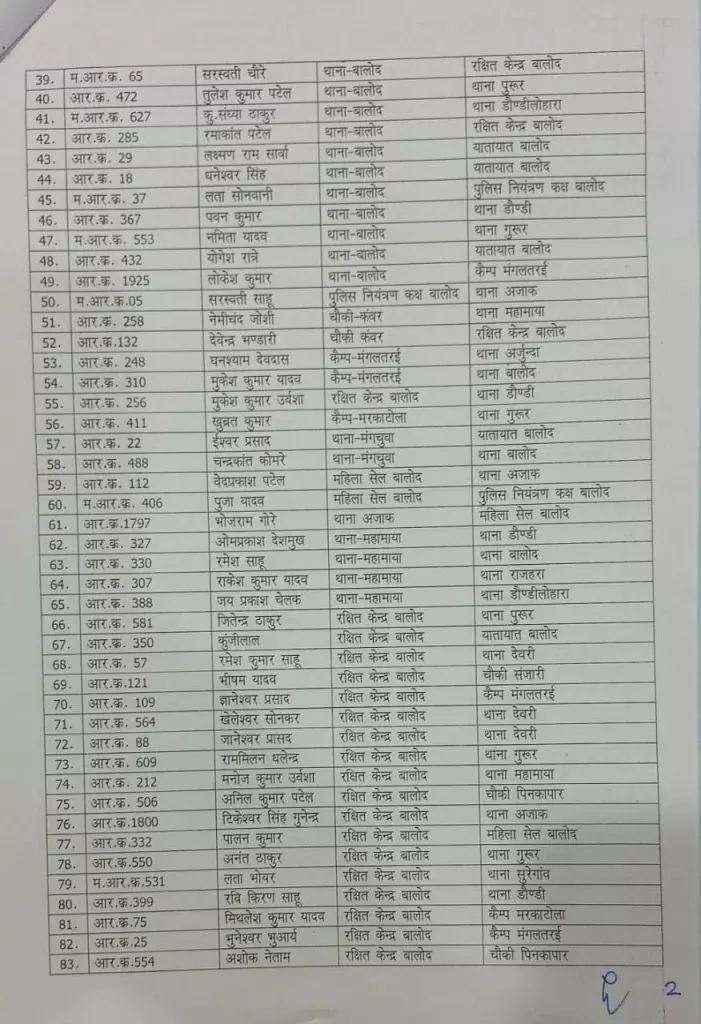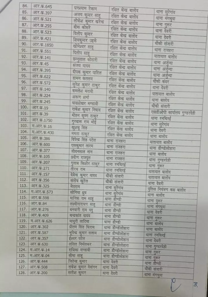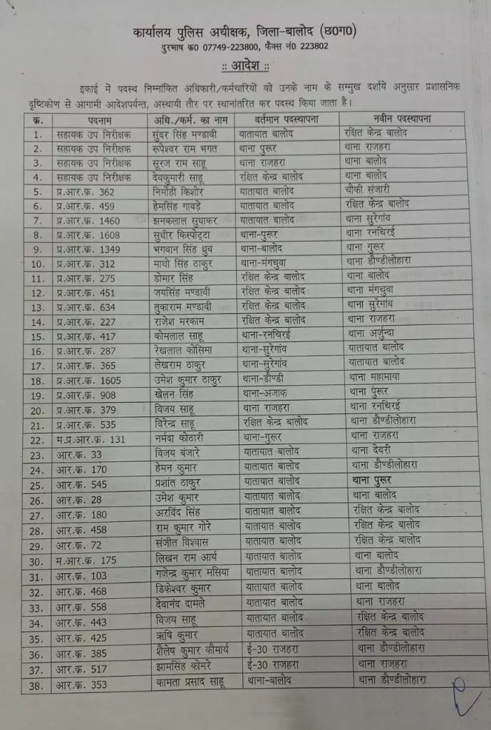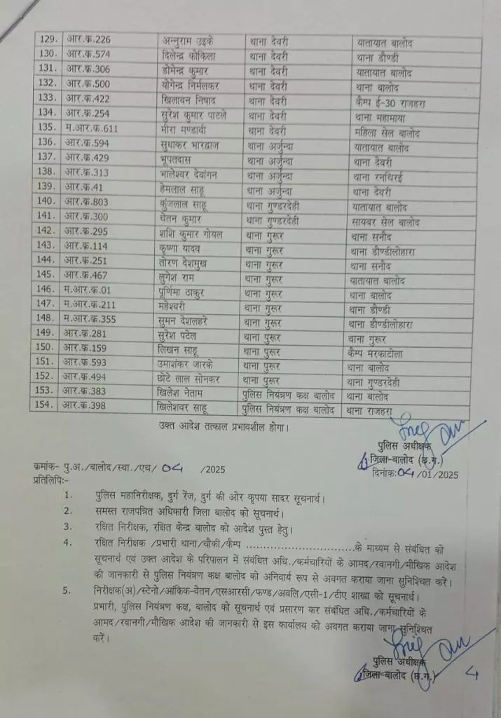 बालोद । बालोद जिले के पुलिस अधीक्षक सुरजन राम भगत ने ASI, प्रधान आरक्षक समेत 154 पुलिसकर्मियों का तबादला किया है। इस सम्बन्ध में आदेश जारी किया गया है।