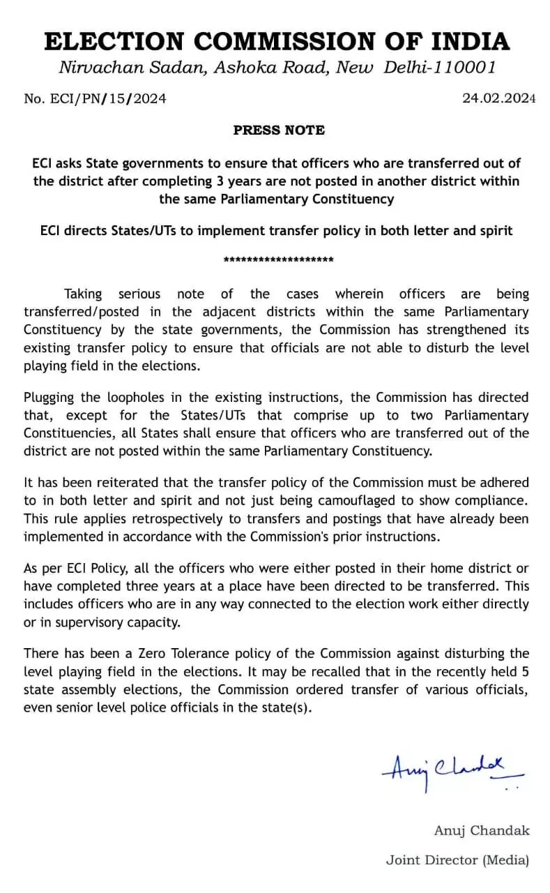 यह दोहराया गया है कि आयोग की स्थानांतरण नीति का अक्षरश: पालन किया जाना चाहिए, न कि अनुपालन दिखाने के लिए इसे छिपाया जाना चाहिए। यह नियम उन तबादलों और पोस्टिंग पर पूर्वव्यापी रूप से लागू होता है जिन्हें आयोग के पूर्व निर्देशों के अनुसार पहले ही लागू किया जा चुका है। ईसीआई नीति के अनुसार, उन सभी अधिकारियों को स्थानांतरित करने का निर्देश दिया गया है जो या तो अपने गृह जिले में तैनात थे या एक स्थान पर तीन साल पूरे कर चुके हैं। इसमें वे अधिकारी शामिल हैं जो सीधे या पर्यवेक्षी क्षमता में किसी भी तरह से चुनाव कार्य से जुड़े हुए हैं। चुनावों में समान अवसर में खलल डालने के खिलाफ आयोग की जीरो टॉलरेंस नीति रही है। यह याद किया जा सकता है कि हाल ही में हुए 5 राज्यों के विधानसभा चुनावों में, आयोग ने विभिन्न अधिकारियों, यहां तक कि राज्य में वरिष्ठ स्तर के पुलिस अधिकारियों के स्थानांतरण का आदेश दिया था।