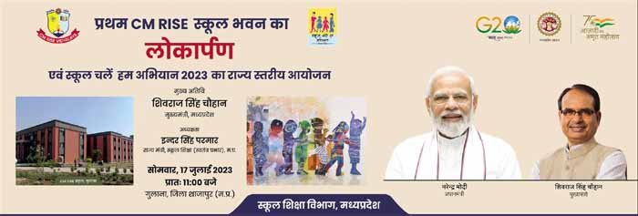 मुख्यमंत्री शिवराज सिंह चौहान 17 जुलाई को "स्कूल चलें हम अभियान 2023" का शुभारंभ करेंगे। राज्य स्तरीय शुभारंभ कार्यक्रम शाजापुर जिले के गुलाना में नव-निर्मित सीएम राइज विद्यालय में होगा। कार्यक्रम का सजीव प्रसारण दूरदर्शन एवं आकाशवाणी सहित अन्य संचार माध्यमों पर पूर्वान्ह 11 बजे से किया जायेगा। सभी जिलों की सभी शासकीय शालाओं में कार्यक्रम का सजीव प्रसारण दिखाया जाएगा।