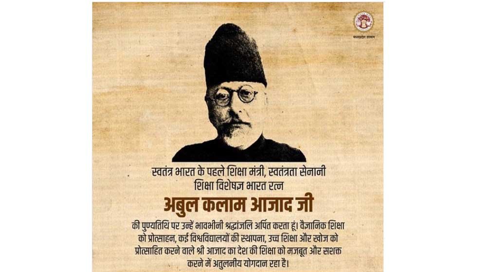 मुख्यमंत्री डॉ. मोहन यादव ने भारत रत्न से सम्मानित, देश के प्रथम शिक्षा मंत्री मौलाना अबुल कलाम आजाद की जयंती पर उन्हें सादर नमन किया है एवं प्रदेशवासियों को राष्ट्रीय शिक्षा दिवस की बधाई दी है।