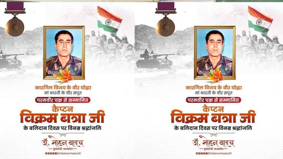 मुख्यमंत्री डॉ. मोहन यादव ने परमवीर चक्र से सम्मानित कैप्टन विक्रम बत्रा जी के बलिदान दिवस पर सादर श्रद्धांजलि अर्पित की। मुख्यमंत्री डॉ. यादव ने कहा कि कारगिल युद्ध के दौरान कैप्टन बत्रा ने अदम्य साहस, शौर्य व पराक्रम का परिचय देते हुए मातृभूमि के सम्मान व स्वाभिमान की रक्षा कर अपना सर्वस्व न्यौछावर कर दिया। कैप्टन बत्रा का जीवन युवाओं को सदैव प्रेरणा देता रहेगा।