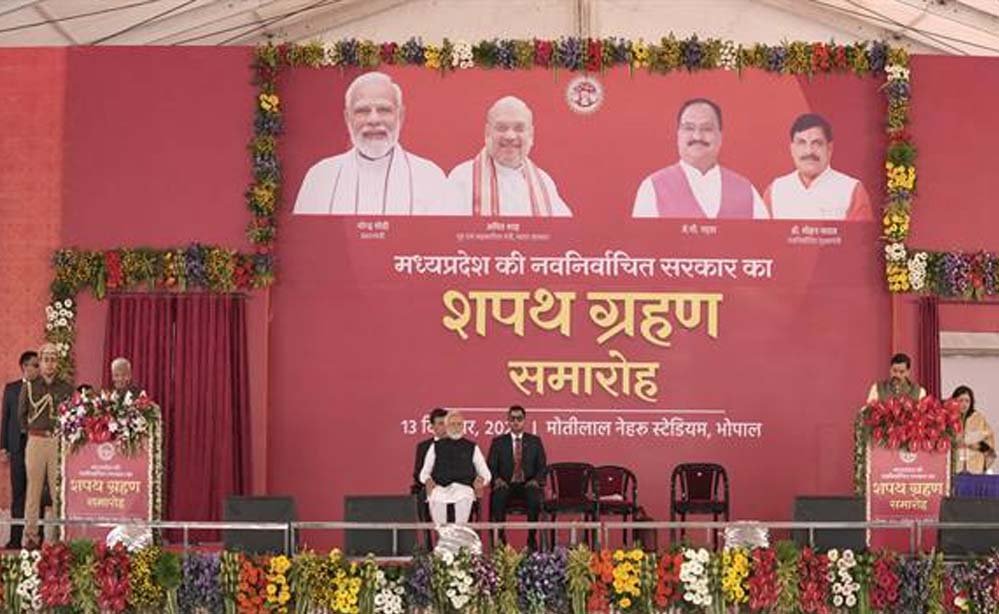 प्रधानमंत्री नरेंद्र मोदी की गरिमामयी उपस्थिति में राज्यपाल मंगुभाई पटेल ने आज राजधानी भोपाल के मोतीलाल नेहरू स्टेडियम में शपथ ग्रहण समारोह में डॉ. मोहन यादव को मुख्यमंत्री पद और गोपनीयता की शपथ दिलाई।