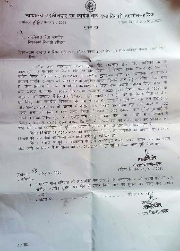मध्य प्रदेश मे ही नही बल्कि समूचे भारत मे राजस्व संबंधित जमीन – जायदाद या प्रॉपर्टी वाले मामले पूर्णतया लंबित चलते रहते हैं। लेकिन मामला अगर न्यायालय तक पहुंच जाए और न्यायालय संबंधित अधिकारी को आदेश कर दें तो पूर्ण रूप से यह माना जाता है कि उसका निराकरण सभवतः हो गया है । लेकिन मध्य प्रदेश के हरदा जिले का एक ऐसा ही मामला प्रकाश में आया है। जहां पर जबलपुर उच्च न्यायालय ने प्रशासनिक अधिकारियों को 10 एकड़ पर फरियादी को कब्जा दिलाने की बात कही है, परंतु उक्त मामले मे देरी हो रही है । हरदा जिले के तहत तहसील हंडिया मे ग्राम उन्ढाल के किसान रामनिवास पिता जगदीश विश्वकर्मा के द्वारा उच्च न्यायालय जबलपुर मे रिट पिटीशन दायर की थी । कोर्ट ने रामनिवास को कब्जा दिलाने के लिए संबंधितों को आदेश किया था , जिसकी तारीख 28 जनवरी थी। लेकिन अभी तक वहाँ कोई प्रशासनिक अधिकारी नही पहुँचा । उस जमीन पर तीन लोगों का कब्जा बताया जा रहा है । जानकारी के मुताबिक आवेदक पूर्व मंत्री का गरीबी बताया जा रहा है।