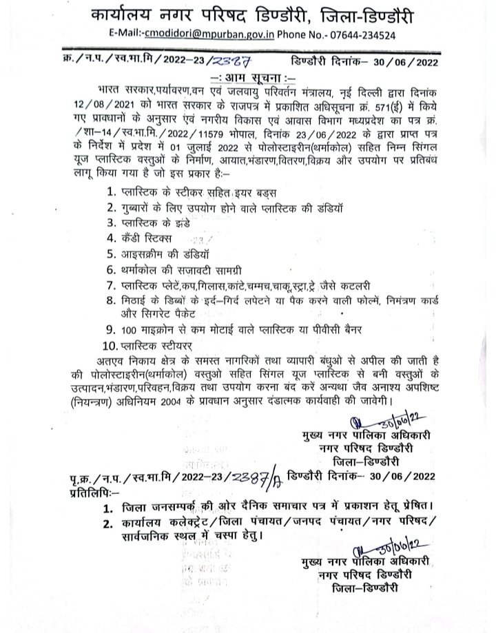 सूचना नगर परिषद डिंडोरी द्वारा जारी आदेश अनुसार सिंगल यूज प्लास्टिक के क्रय एवं विक्रय पर पूरी तरह से रोक लग जायेगा , जिसमे प्लास्टिक स्टिक वाले ईयर वर्ड , बैलून , प्लास्टिक झंडे , कैंडी स्टिक , सजावट में उपयोग होने वाले थर्माकोल , प्लेट , ग्लास , चम्मच , स्ट्रा , चाकू, ट्रे, स्वीट बॉक्स, निमंत्रण पत्र , सिगरेट पैकेट के ऊपर लगी प्लास्टीक , प्लास्टिक स्टीकर्स , जैसे 100 माइक्रोन से कम मोटाई वाले सिंगल यूज प्लास्टिक बंद होंगे,इसके साथ ही प्रदेश में सिंगल यूज प्लास्टिक को बंद करने के लिए निर्माता – विक्रेताओ – रिटेलर पर छापामार कार्यवाही की जाएगी , साथ ही ही नगरीय निकायों द्वारा सिंगल यूज प्लास्टिक वैन पर जनजागृति कार्यक्रम आयोजित किये जायेंगे , केंद्रीय प्रदूषण बोर्ड द्वारा पोर्टल पर नगरीय निकायों के पंजीकरण होगा , जिला कलेक्टर की अध्यक्षता में जिलास्तरीय एवं निकाय स्तरीय टॉस्क फोर्स द्वारा नियमित समीक्षा की जाएगी , प्लास्टिक प्रतिबंध होने वाले उद्योगों को प्रदेश स्तर पर सब्सिडी एवं इंसेंटिव का प्रावधान होगा।