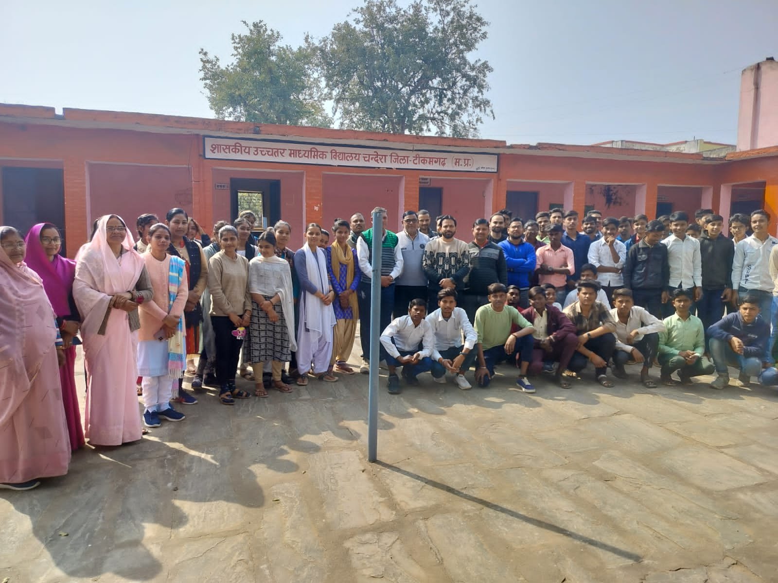 शासकीय उच्चतर माध्यमिक विद्यालय चंदेरा टीकमगढ़ में बुंदेलखंड के समाजसेवी राष्ट्रीय आदर्श शिक्षा रत्न उपाधि से सम्मानित संतोष गंगेले कर्मयोगी द्वारा विद्यालय में विद्यार्थियों को वार्षिक परीक्षा की तैयारी निश्चित से देने एवं समय सारणी बनाकर पढ़ने की विभिन्न प्रकार के टिप्स दिए गए बच्चों को नैतिक शिक्षा संस्कार तथा यातायात नियमों की जानकारी दी गई माता-पिता गुरु का सम्मान करने एवं निमित्त रूप से कुछ समय में देश और राष्ट्र के प्रति समर्पित होकर कार्य करने का संकल्प दिलाया गया।