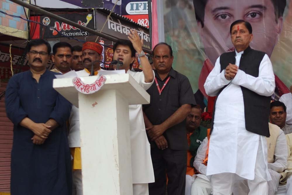 अभी चुनाव चल रहे है अभी भी नहीं आए जो मुख्यमंत्री ज़िला मुख्यालय में नहीं आए वो अगर सरकार में आ गया तो क्या पाँच साल में कभी आएगा ? भिंड एक स्वाभिमानी ज़िला है अगर आपके साथ ऐसा व्यवहार किया जा रहा है तो मैं आपसे निवेदन करता हूँ की कांग्रेस की बोरी बिस्तर बांध कर उस पर बड़ा ताला लगाकर, चाभी को चम्बल में फेंक दो। भाजपा ने भिंड को हमेशा प्राथमिकता दी है। अगर आपने चाहा कि भिंड नगर निगम बनना चाहिए तो भाजपा ने उसे नगर निगम बनाया है। यह बात केंद्रीय मंत्री ज्योतिरादित्य सिंधिया ने भिण्ड में पार्टी प्रत्याशी के समर्थन में जनसभा को संबोधित करते हुए कही।