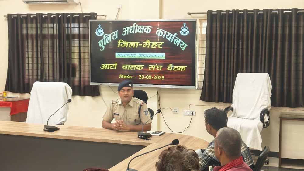 इसी क्रम में पुलिस अधीक्षक मैहर श्री अवधेश प्रताप सिंह के निर्देश पर यातायात जागरुकता हेतू आज दिनांक 20/09/25 को यातायात प्रभारी नृपेंद्र सिंह द्वारा पुलिस अधीक्षक कार्यालय के सभागार में ऑटो चालकों की मीटिंग लेकर उन्हें यातायात नियमों का पालन करने और सड़क सुरक्षा के महत्व के बारे में बताया गया। यातायात नियमों का पालन करना न केवल ऑटो चालकों बल्कि यात्री की सुरक्षा के लिए भी आवश्यक है। ऑटो चालकों को गति सीमा का पालन करने एवम सड़क पर सावधानी से वाहन चलाने की समझाइश दी गई।