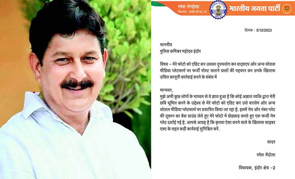 इंदौर-2 विधानसभा क्षेत्र के नवनिर्वाचित बीजेपी विधायक रमेश मेंदोला की शिकायत के मुताबिक उनकी छवि धूमिल करने के लिए इस तस्वीर में उन्हें ऐसी नेम प्लेट थामे दिखाया गया है जिसमें उनके नाम के आगे "गृह और परिवहन मंत्री, मध्यप्रदेश सरकार'' लिखा गया है. यह तस्वीर सोशल मीडिया पर तेजी से वायरल हो रही है.